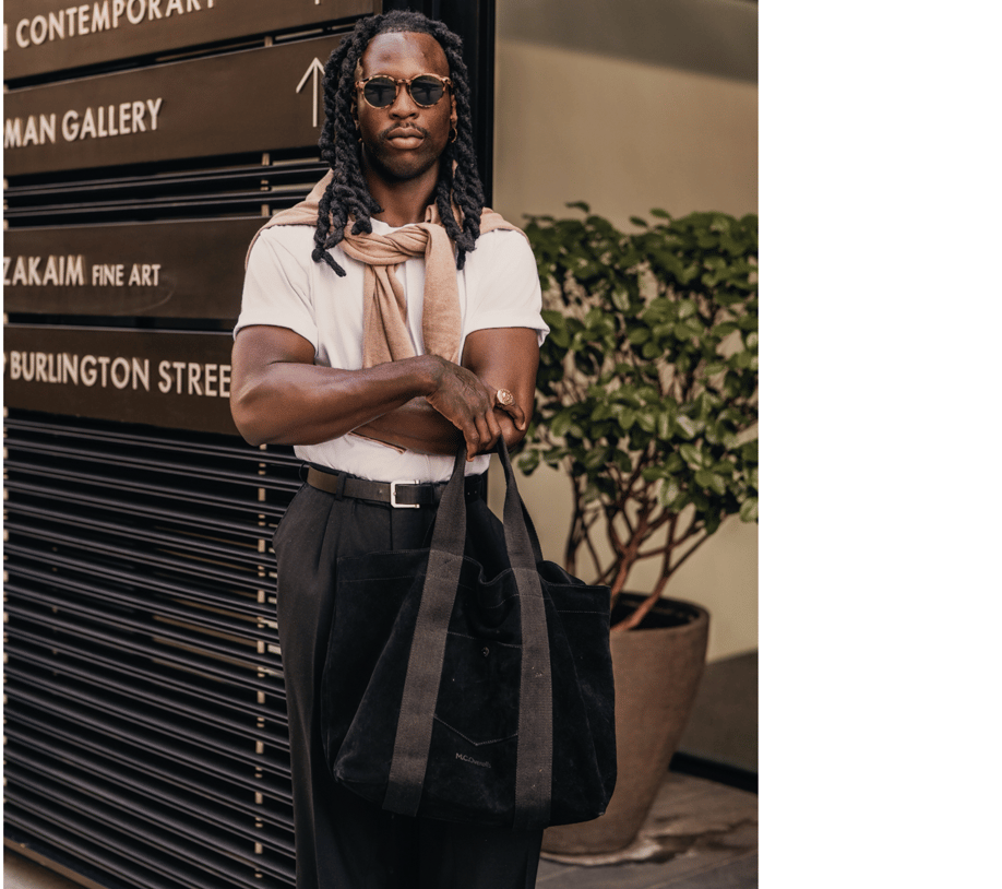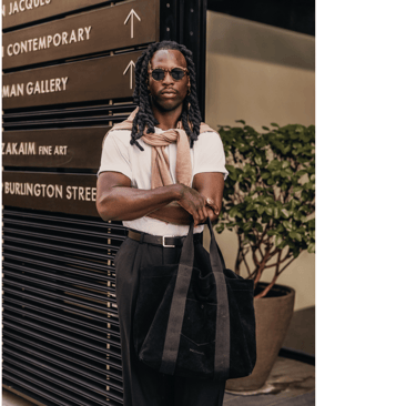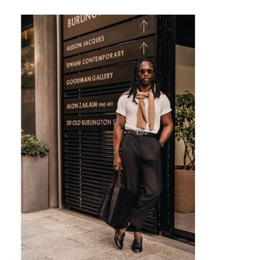 Photographed outside the cultural pulse of Burlington Street’s art scene, this outfit tells a story of minimalism elevated by mastery. It’s what happens when off-duty style still respects the moment.