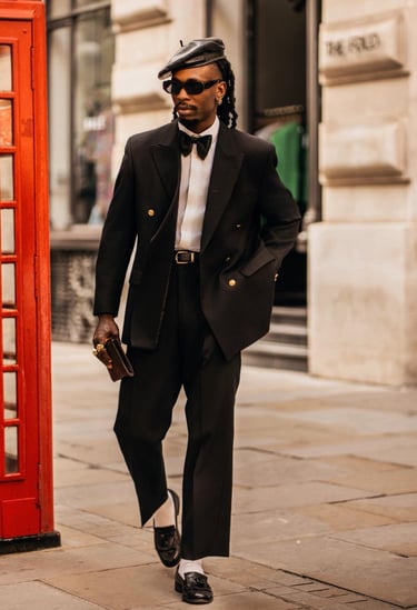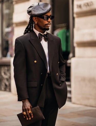 • Black Double-Breasted Suit Jacket – With strong shoulders, gold-tone buttons, and European sharpness, this blazer doesn’t knock politely. It kicks the door open.